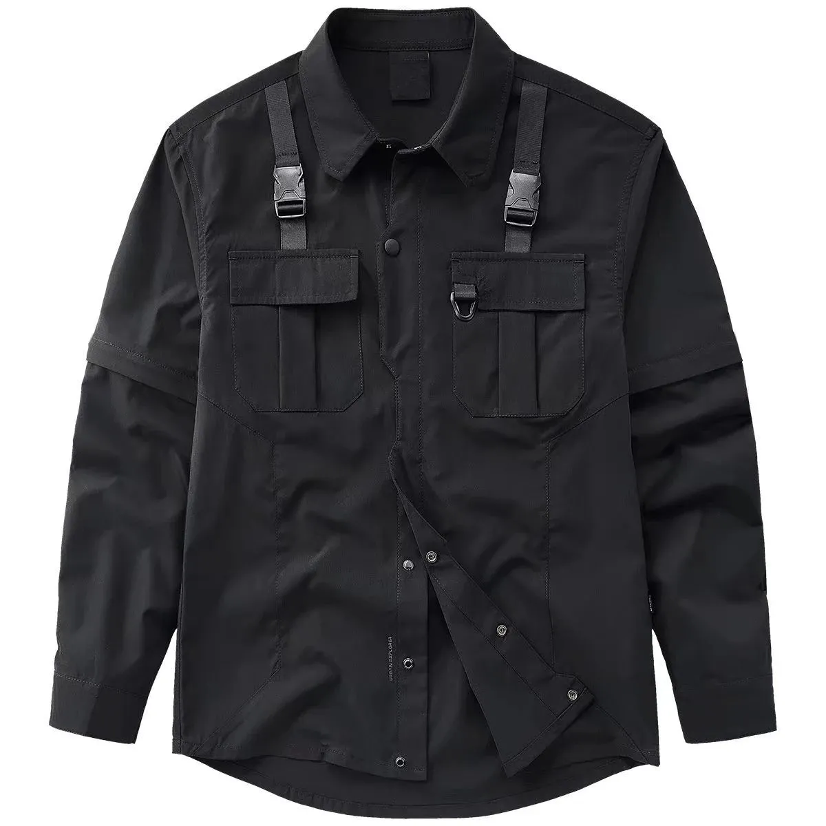 Sale!Coal Black Buckles Up Chest Pockets T-Shirt