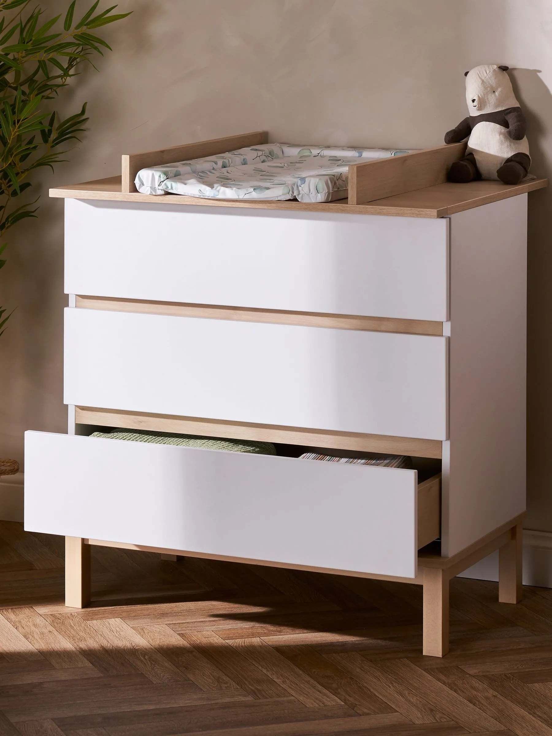 The Rafi Dresser Changer has a modern, minimalist style that is sure to be admired for years to come. Spot the subtle linear embellishment and soft leather handles, the perfect details for the modern nursery. The dresser changer is a 2-in-1 piece of nursery furniture that provides you with storage options and a place to get your baby ready for the day ahead. Rafi has 3 spacious drawers to keep your little one’s things organised and tidy. With soft-close drawer runners, you can avoid disturbing your snoozing baby as you put their clothes away. A removable changing top means you can simply convert the dresser changer into a standalone dresser once your baby has outgrown the changing unit.